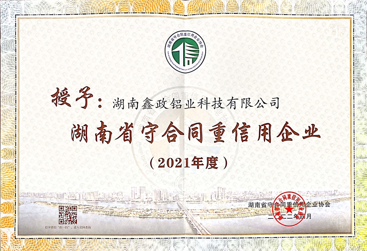 瀏覽次數:1108近日,2021年度湖南省“守合同重信用企業”名單公布,湖南鑫政鋁業科技有限公司榮膺湖南省“守合同重信用企業”稱號。