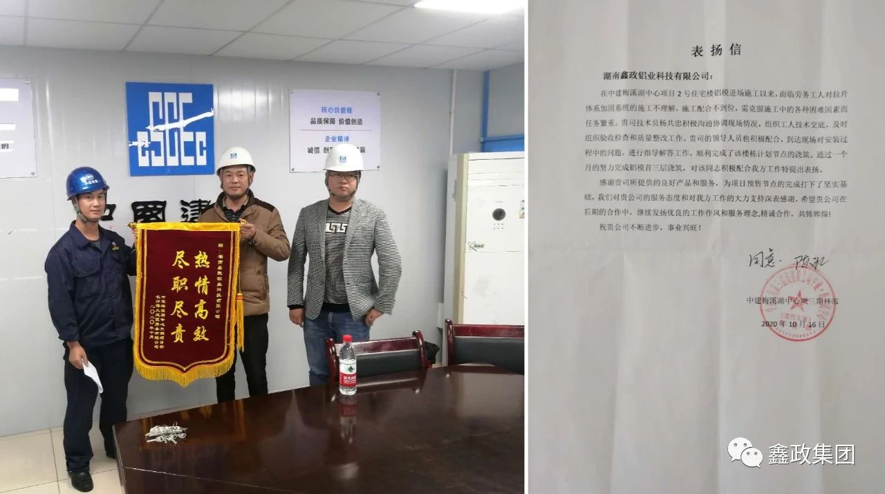 瀏覽次數:1359近日,中建五局第三建設有限公司中建梅溪湖中心項目部和現場勞務公司長沙博大建筑勞務有限公司送來錦旗和表揚信,對鑫政鋁業技術服務科楊共忠在項目上的出色表現給予了充分肯定和高度評價。_20250530091630A310.jpg)