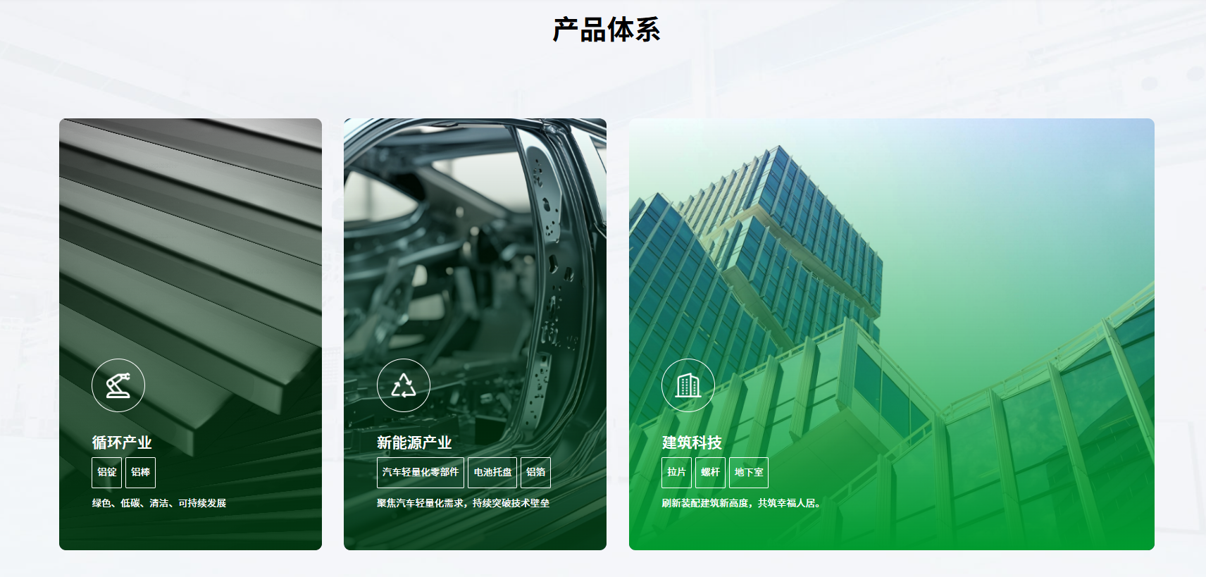 官網系統性重構產品展示體系,清晰呈現循環產業、新能源產業、建筑科技三大核心業務版圖,以精煉內容與層次化視覺設計,突顯鑫政從建筑科技向新能源材料領域的戰略延伸。